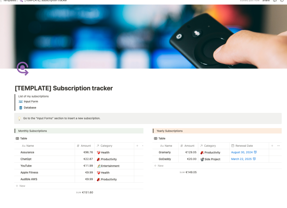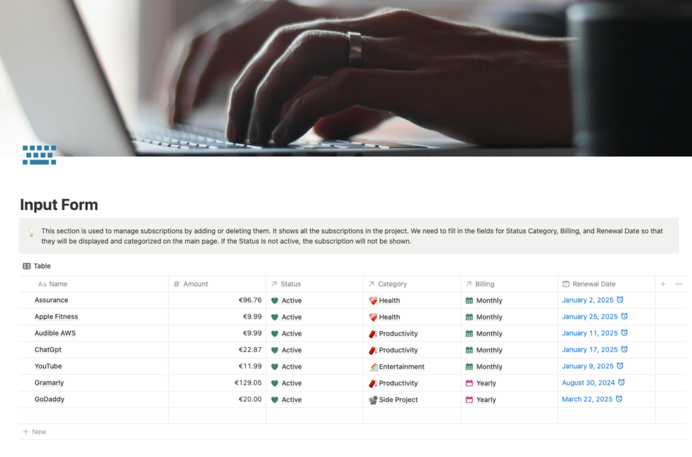 - Monthly Subscriptions Database: View all your active monthly subscriptions at a glance. Track the total amount spent each month and ensure no subscription goes unnoticed.